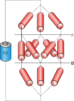 This problem can of course be solved using the standard network theorems, but there is a simpler method. Note in the diagram below that due to the symmetry of the arrangement, all the nodes at A have the same potential (as do the nodes at B).